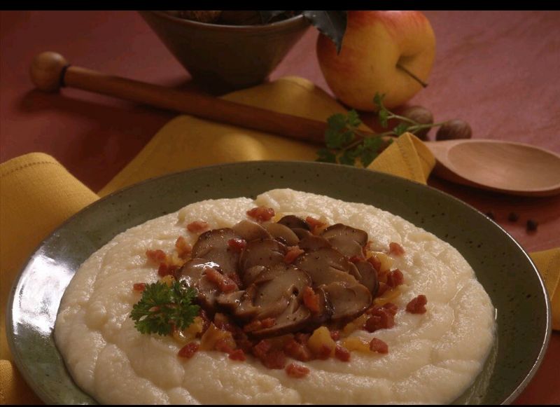 Crema de patatas con panceta y setas
