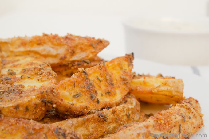 Cortamos las patatas en gajos grandes, sin pelar, las mezclamos con nuestro aliño secreto y las freímos.