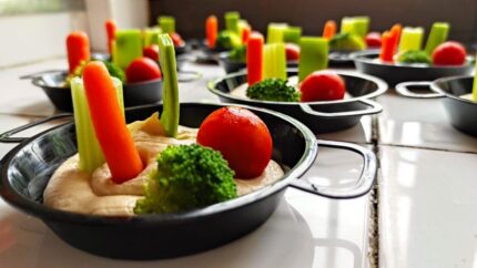 Arroz, aguacate, zanahoria, piña, edamame, wakame, rabanito, salmón y sésamo con salsa de soja
