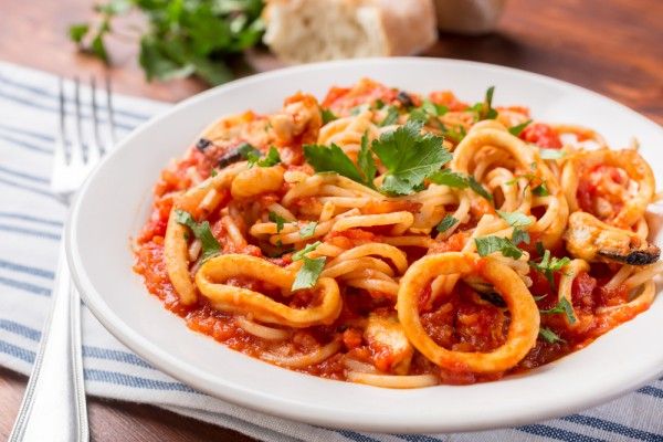 Spaghetti con calamares en salsa americana