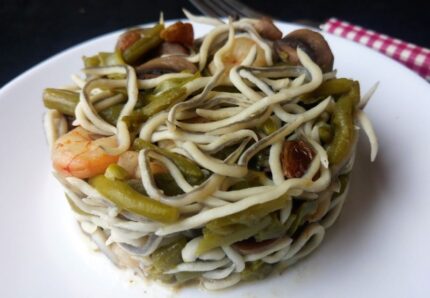 Timbal de judias verdes, gulas y gambas